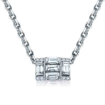 Подвеска с 5 бриллиантами выращенными, 0.4 карат, огранка багет 33 грани, цвет 3, чистота 6, тип огранки А; 8 бриллиантами выращенными, 0.03 карат, огранка круг 57 граней, цвет 3, чистота 6, тип огранки А; Белое золото 585 пробы.