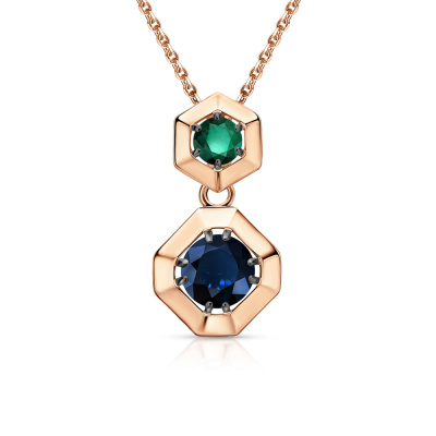 Подвеска с 1 сапфиром синтетическим, 1 карат; 1 гидротермальным изумрудом, 0.2 карат; Розовое золото 585 пробы.