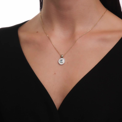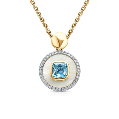 Подвеска с 36 бриллиантами природными, 0.1 карат, огранка круг 17 граней, цвет 2, чистота 3; 1 топазом свисс природным, 0.66 карат; 1 перламутром белым природным; Желтое золото 585 пробы.