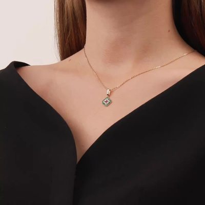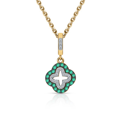 Подвеска с 3 бриллиантами природными, 0.01 карат, огранка круг 17 граней, цвет 2, чистота 2, тип огранки А; 20 бриллиантами природными, 0.04 карат, огранка круг 17 граней, цвет 2, чистота 2, тип огранки А; 20 изумрудами природными, 0.13 карат, цвет 3, чистота 3, тип огранки В; Желтое золото 585 пробы.