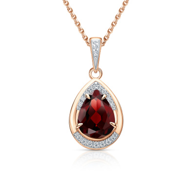 Подвеска с 19 бриллиантами природными, 0.04 карат, огранка круг 17 граней, цвет 2, чистота 2, тип огранки А; 1 гранатом природным, 1.21 карат; Розовое золото 585 пробы.