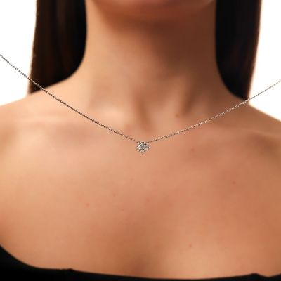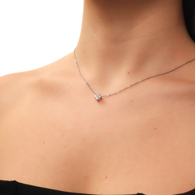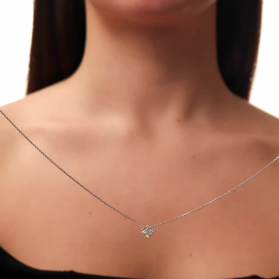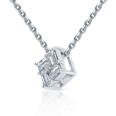 Подвеска с 4 бриллиантами выращенными, 0.35 карат, огранка багет 33 грани, цвет 3, чистота 5, тип огранки А; 1 бриллиантом выращенным, 0.01 карат, огранка круг 57 граней, цвет 3, чистота 5, тип огранки А; Белое золото 585 пробы.
