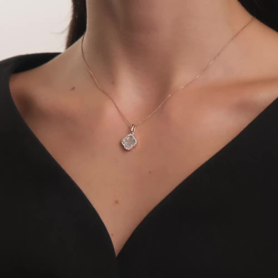 Подвеска с 24 бриллиантами природными, 0.09 карат, огранка круг 17 граней, цвет 2, чистота 2, тип огранки А; 1 перламутром белым природным, 0.97 карат; Розовое золото 585 пробы.