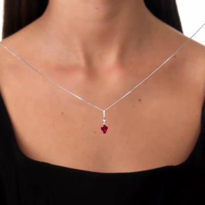 Подвеска с 1 рубином выращенным, 1.45 карат; 5 бриллиантами выращенными, 0.03 карат, огранка круг 57 граней, цвет 3, чистота 6, тип огранки А; Белое золото 585 пробы.