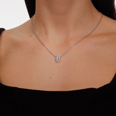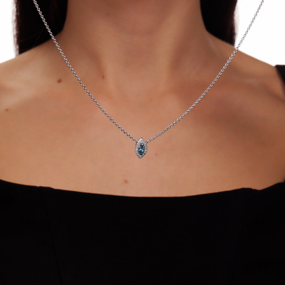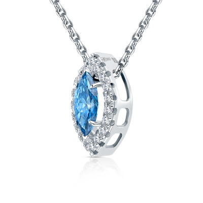 Подвеска с 1 бриллиантом выращенным, 0.47 карат, огранка маркиз 55 граней, цвет Голубой, чистота 5, тип огранки А; 18 бриллиантами выращенными, 0.1 карат, огранка круг 57 граней, цвет 3, чистота 5, тип огранки А; Белое золото 585 пробы.
