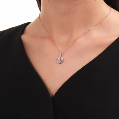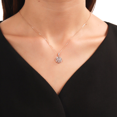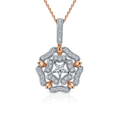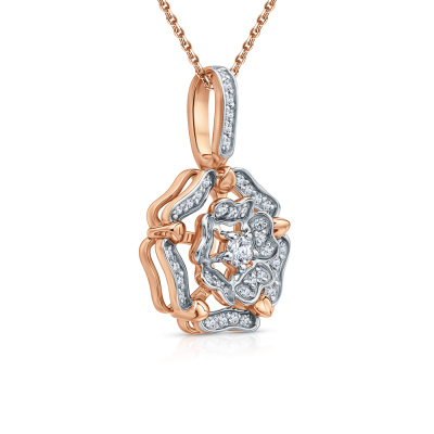Подвеска с 1 бриллиантом природным, 0.03 карат, огранка круг 57 граней, цвет 3, чистота 6, тип огранки А; 41 бриллиантом природным, 0.08 карат, огранка круг 17 граней, цвет 2, чистота 2, тип огранки А; Розовое золото 585 пробы.