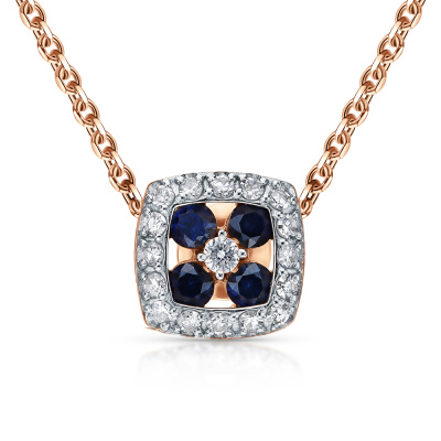 Подвеска с 1 бриллиантом природным, 0.01 карат, огранка круг 57 граней, цвет 3, чистота 6; 16 бриллиантами природными, 0.07 карат, огранка круг 17 граней, цвет 2, чистота 2; 4 сапфирами природными, 0.15 карат, цвет 2, чистота 2; Розовое золото 585 пробы.