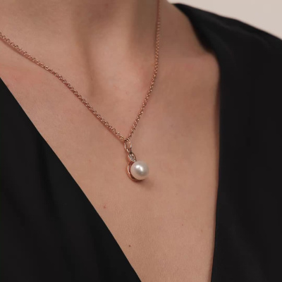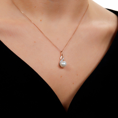 Подвеска с 9 бриллиантами природными, 0.03 карат, огранка круг 17 граней, цвет 2, чистота 2, тип огранки А; 1 жемчугом пресноводным культивированным белым; Розовое золото 585 пробы.