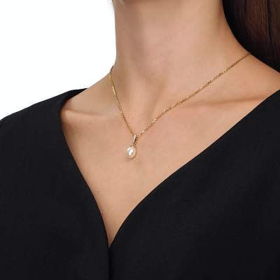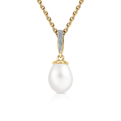 Подвеска с 3 бриллиантами природными, 0.01 карат, огранка круг 17 граней, цвет 2, чистота 2, тип огранки А; 1 жемчугом пресноводным культивированным белым; Желтое золото 585 пробы.