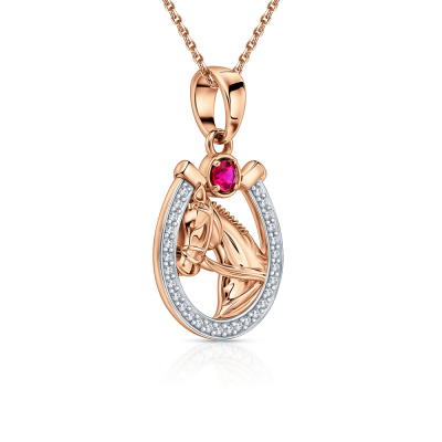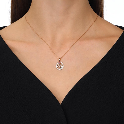 Подвеска с 28 бриллиантами природными, 0.09 карат, огранка круг 17 граней, цвет 2, чистота 2, тип огранки А; 1 рубином синтетическим, 0.07 карат; Розовое золото 585 пробы.
