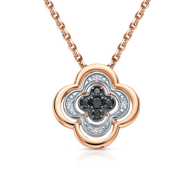 Подвеска с 4 бриллиантами природными, 0.01 карат, огранка круг 17 граней, цвет 2, чистота 2, тип огранки А; 1 бриллиантом черным природным облагороженным, 0.02 карат, огранка круг 57 граней, цвет 7, чистота 6, тип огранки А; 4 бриллиантами черными природными облагороженными, 0.03 карат, огранка круг 57 граней, цвет 7, чистота 6, тип огранки А; Розовое золото 585 пробы.