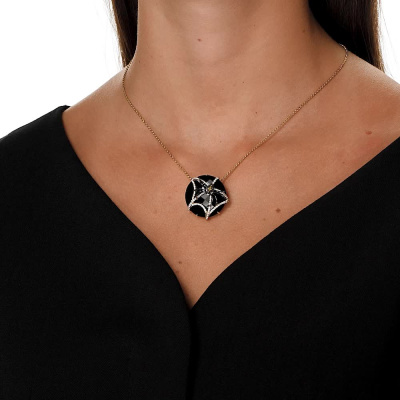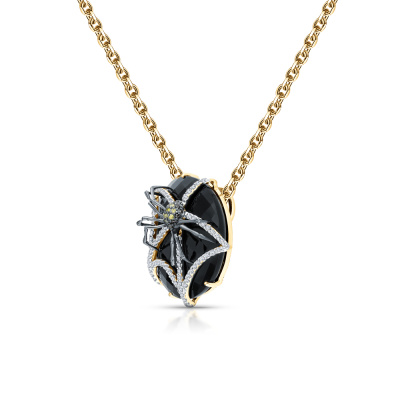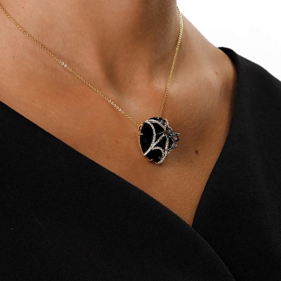 Подвеска с 81 бриллиантом природным, 0.38 карат, огранка круг 57 граней, цвет 4, чистота 5, тип огранки А; 1 ониксом черным природным, 31.71 карат, тип огранки А; 8 бриллиантами желтыми природными облагороженными, 0.04 карат, огранка круг 17 граней, цвет 5, чистота 3, тип огранки А; 11 бриллиантами черными природными облагороженными, 0.05 карат, огранка круг 57 граней, цвет 7, чистота 9, тип огранки А; Желтое золото 585 пробы.