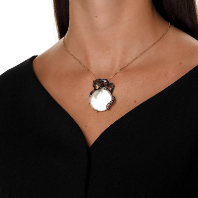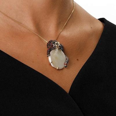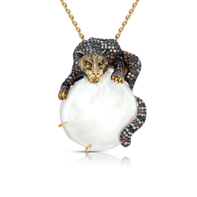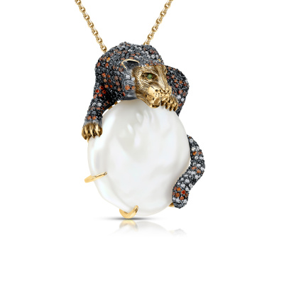 Подвеска с 1 бриллиантом природным, 0.008 карат, огранка круг 57 граней, цвет 4, чистота 5, тип огранки А; 74 бриллиантами природными, 0.34 карат, огранка круг 57 граней, цвет 4, чистота 5, тип огранки А; 1 жемчуом барочным культивированным белым, 34 карат, тип огранки А; 36 бриллиантами черными природными облагороженными, 0.33 карат, огранка круг 57 граней, цвет 7, чистота 6, тип огранки А; 52 бриллиантами коричневыми природными, 0.47 карат, огранка круг 57 граней, цвет 6, чистота 5, тип огранки А; 2 бриллиантами зелеными природными облагороженными, 0.01 карат, огранка круг 57 граней, цвет 5, чистота 5, тип огранки А; 90 бриллиантами коричневыми природными, 0.47 карат, огранка круг 57 граней, цвет 6, чистота 5, тип огранки А; 87 бриллиантами черными природными облагороженными, 0.44 карат, огранка круг 57 граней, цвет 7, чистота 6, тип огранки А; Желтое золото 585 пробы.