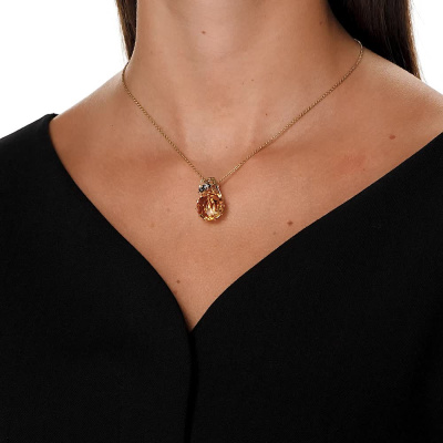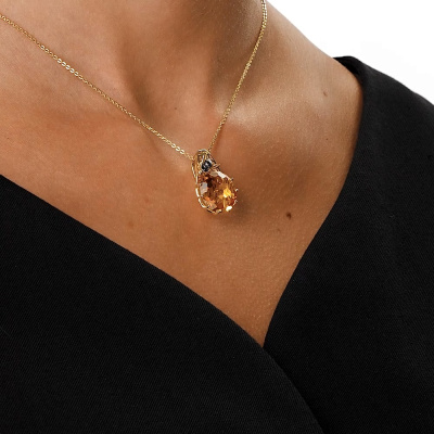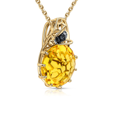 Подвеска с 3 бриллиантами природными, 0.01 карат, огранка круг 57 граней, цвет 3, чистота 6, тип огранки А; 1 кварцем желтым, 10.02 карат, тип огранки А; 8 бриллиантами черными природными облагороженными, 0.05 карат, огранка круг 57 граней, цвет 7, чистота 6, тип огранки А; Желтое золото 585 пробы.