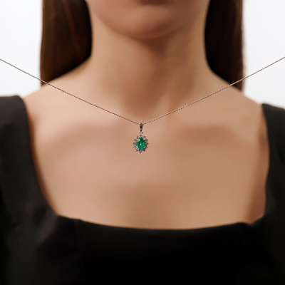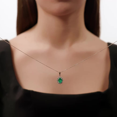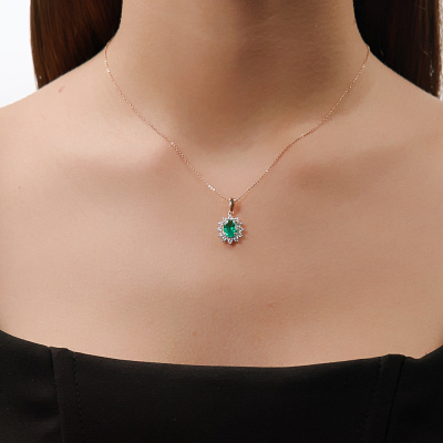 Подвеска с 1 изумрудом выращенным Колумбия, 1.01 карат; 12 бриллиантами выращенными, 0.49 карат, огранка круг 57 граней, цвет 3, чистота 5, тип огранки А; Розовое золото 585 пробы.