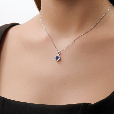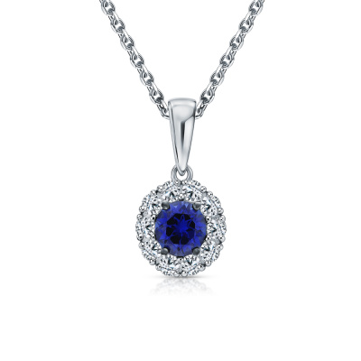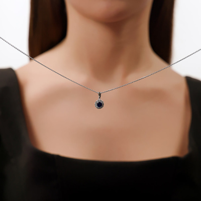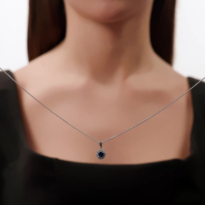 Подвеска с 1 сапфиром выращенным, 0.62 карат; 10 бриллиантами выращенными, 0.31 карат, огранка круг 57 граней, цвет 3, чистота 5, тип огранки А; Белое золото 585 пробы.