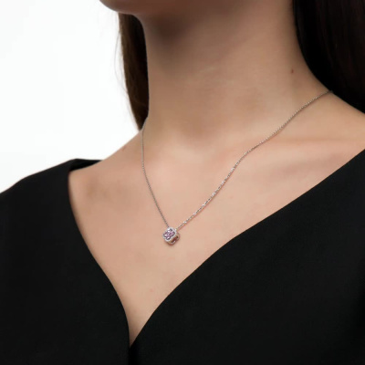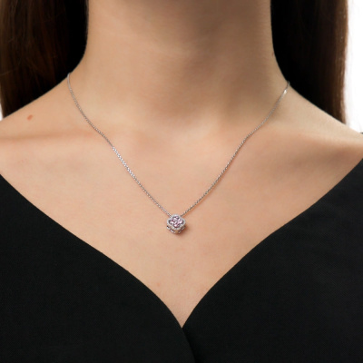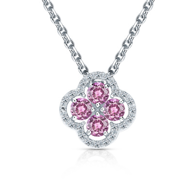 Подвеска с 24 бриллиантами природными, 0.06 карат, огранка круг 17 граней, цвет 2, чистота 2, тип огранки А; 4 сапфирами розовыми природными, 0.39 карат, тип огранки В; Белое золото 585 пробы.