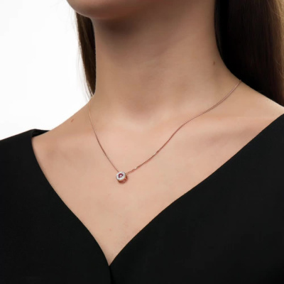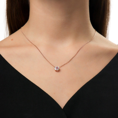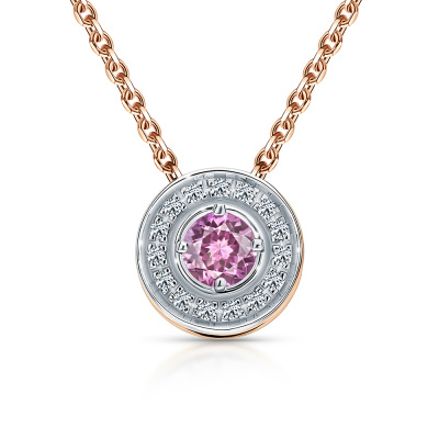 Подвеска с 15 бриллиантами природными, 0.03 карат, огранка круг 17 граней, цвет 2, чистота 2, тип огранки А; 1 сапфиром розовым природным, 0.21 карат, тип огранки В; Розовое золото 585 пробы.