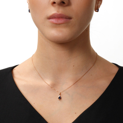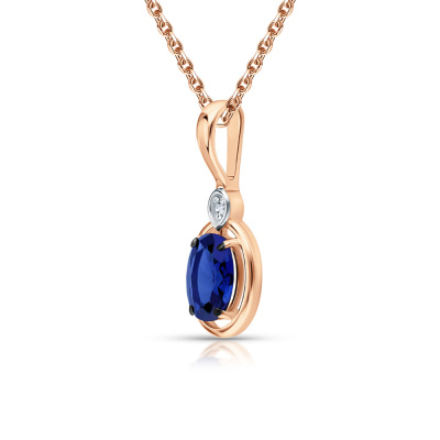Подвеска с 1 бриллиантом природным, 0.004 карат, огранка круг 17 граней, цвет 2, чистота 2; 1 сапфиром синтетическим, 0.43 карат; Розовое золото 585 пробы.