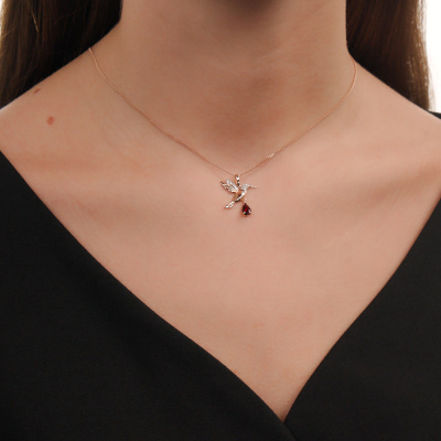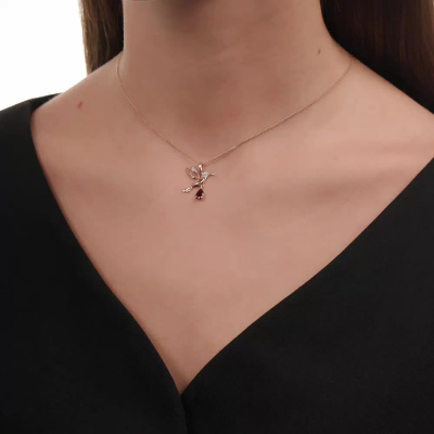 Подвеска с 4 бриллиантами природными, 0.01 карат, огранка круг 17 граней, цвет 2, чистота 2, тип огранки А; 2 бриллиантами природными, 0.006 карат, огранка круг 17 граней, цвет 2, чистота 2, тип огранки А; 1 бриллиантом природным, 0.002 карат, огранка круг 17 граней, цвет 2, чистота 2, тип огранки А; 1 гранатом природным, 0.49 карат; Розовое золото 585 пробы.