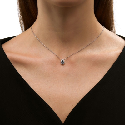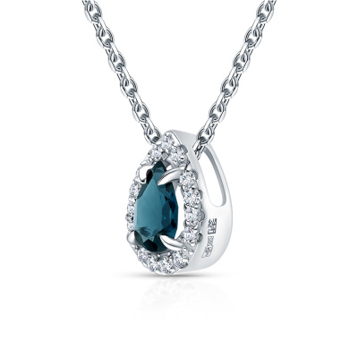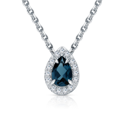 Подвеска с 15 бриллиантами природными, 0.08 карат, огранка круг 17 граней, цвет 2, чистота 2, тип огранки А; 1 топазом лондон природным, 0.41 карат; Белое золото 585 пробы.