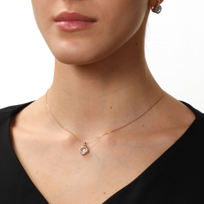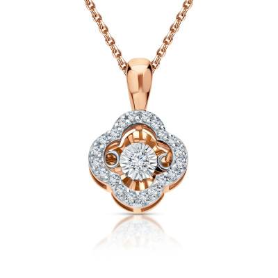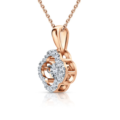 Подвеска с 1 бриллиантом природным, 0.03 карат, огранка круг 57 граней, цвет 3, чистота 6, тип огранки А; 20 бриллиантами природными, 0.08 карат, огранка круг 17 граней, цвет 2, чистота 2, тип огранки А; Розовое и белое золото 585 пробы.
