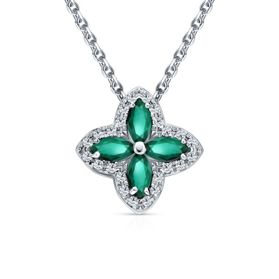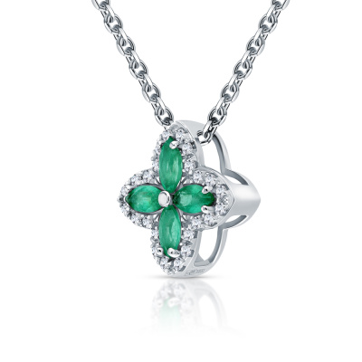 Подвеска с 24 бриллиантами природными, 0.07 карат, огранка круг 17 граней, цвет 2, чистота 2, тип огранки А; 4 изумрудами природными, 0.26 карат, цвет 3, чистота 3, тип огранки В; Белое золото 585 пробы.