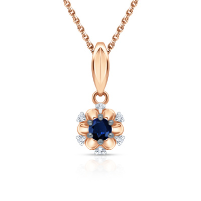 Подвеска с 6 бриллиантами природными, 0.01 карат, огранка круг 17 граней, цвет 2, чистота 2, тип огранки А; 1 сапфиром природным, 0.1 карат, цвет 2, чистота 2, тип огранки В; Розовое золото 585 пробы.