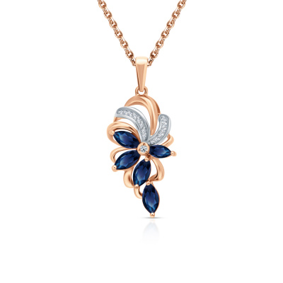 Подвеска с 1 бриллиантом природным, 0.008 карат, огранка круг 17 граней, цвет 2, чистота 2, тип огранки А; 15 бриллиантами природными, 0.03 карат, огранка круг 17 граней, цвет 2, чистота 2, тип огранки А; 4 сапфирами природными, 0.71 карат, цвет 2, чистота 2, тип огранки Б; 1 сапфиром природным, 0.1 карат, цвет 2, чистота 2, тип огранки Б; Розовое золото 585 пробы.