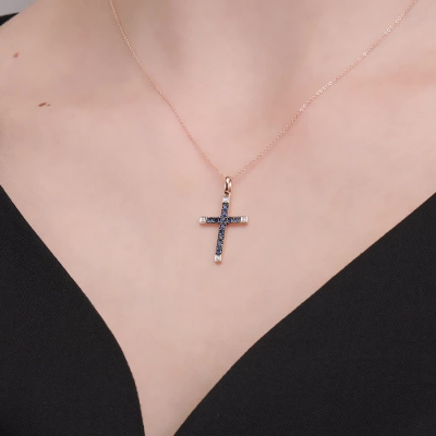 Подвеска с 4 бриллиантами природными, 0.008 карат, огранка круг 17 граней, цвет 2, чистота 2, тип огранки А; 12 сапфирами природными, 0.31 карат, цвет 2, чистота 2, тип огранки В; Розовое золото 585 пробы.