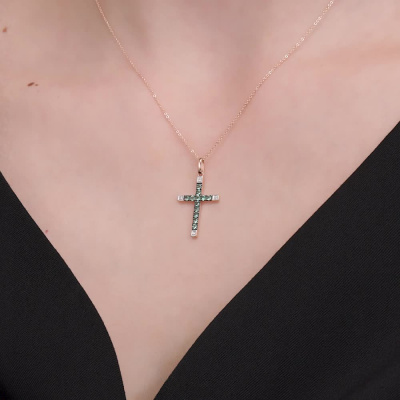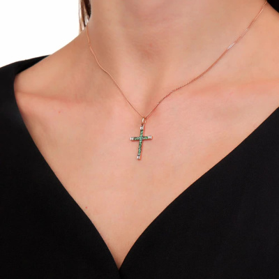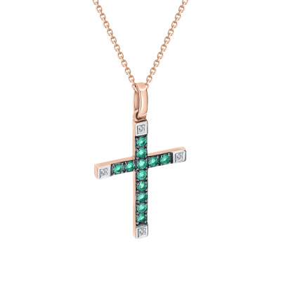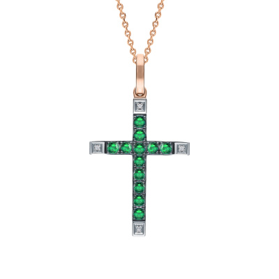 Подвеска с 4 бриллиантами природными, 0.009 карат, огранка круг 17 граней, цвет 2, чистота 2, тип огранки Б; 12 изумрудами природными, 0.21 карат, цвет 3, чистота 3, тип огранки В; Розовое золото 585 пробы.