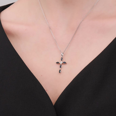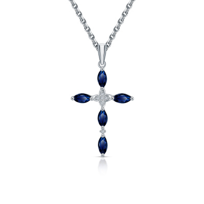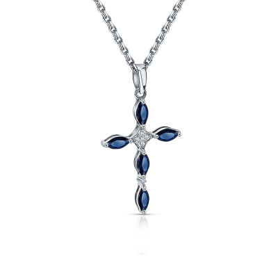 Подвеска с 6 бриллиантами природными, 0.01 карат, огранка круг 17 граней, цвет 2, чистота 2, тип огранки Б; 5 сапфирами природными, 0.81 карат, цвет 2, чистота 2, тип огранки Б; Белое золото 585 пробы.