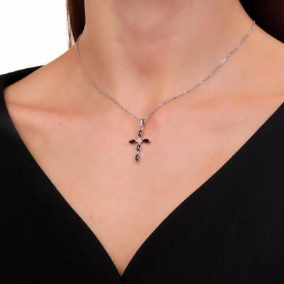 Подвеска с 6 бриллиантами природными, 0.01 карат, огранка круг 17 граней, цвет 2, чистота 2, тип огранки А; 5 сапфирами природными, 0.81 карат, цвет 2, чистота 2, тип огранки Б; Белое золото 585 пробы.