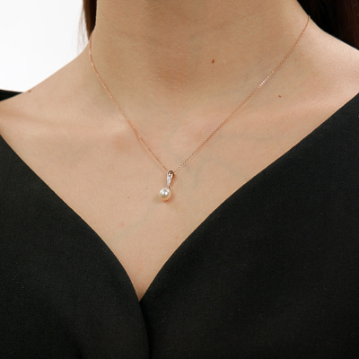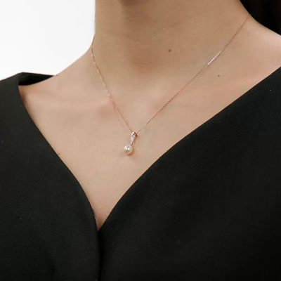 Подвеска с 4 бриллиантами природными, 0.007 карат, огранка круг 17 граней, цвет 2, чистота 2, тип огранки А; 1 жемчугом пресноводным культивированным белым; Розовое золото 585 пробы.