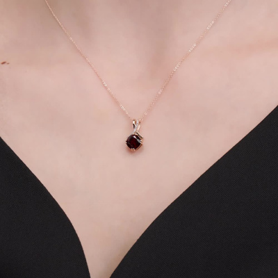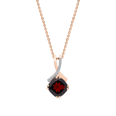 Подвеска с 11 бриллиантами природными, 0.02 карат, огранка круг 17 граней, цвет 2, чистота 2, тип огранки А; 1 гранатом природным, 1.55 карат; Розовое золото 585 пробы.