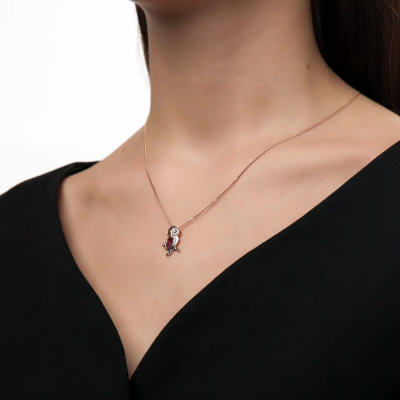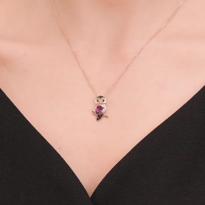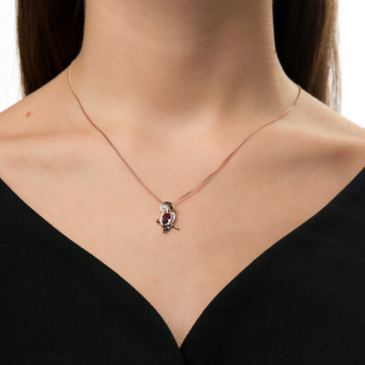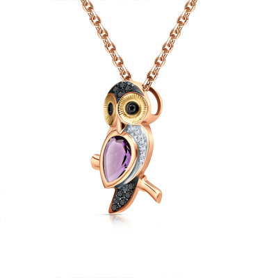 Подвеска с 7 бриллиантами природными, 0.01 карат, огранка круг 17 граней, цвет 2, чистота 2, тип огранки Б; 1 аметистом природным, 0.63 карат; 11 бриллиантами черными природными облагороженными, 0.06 карат, огранка круг 57 граней, цвет 7, чистота 6, тип огранки А; Розовое золото 585 пробы.