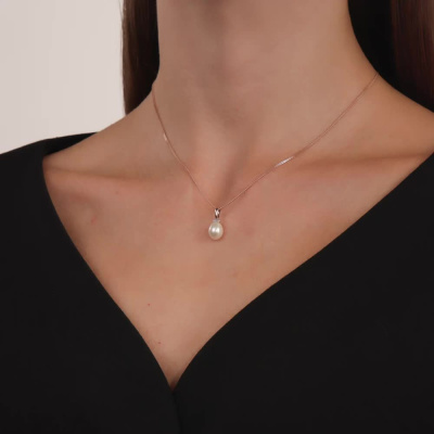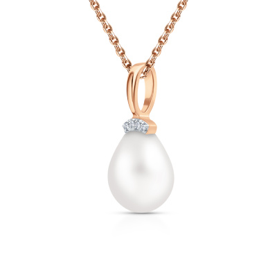 Подвеска с 4 бриллиантами природными, 0.007 карат, огранка круг 17 граней, цвет 2, чистота 2, тип огранки А; 1 жемчугом пресноводным культивированным белым, тип огранки Б; Розовое золото 585 пробы.
