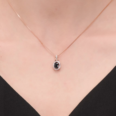 Подвеска с 26 бриллиантами природными, 0.06 карат, огранка круг 17 граней, цвет 2, чистота 2, тип огранки А; 1 сапфиром природным, 0.92 карат, цвет 2, чистота 2, тип огранки Б; Розовое золото 585 пробы.