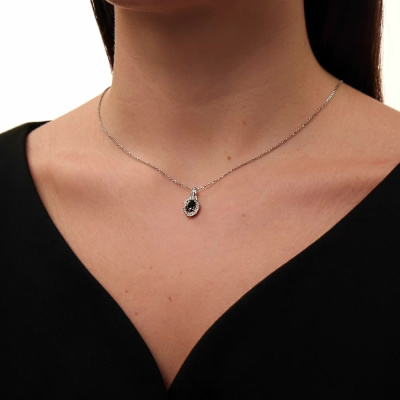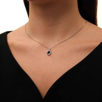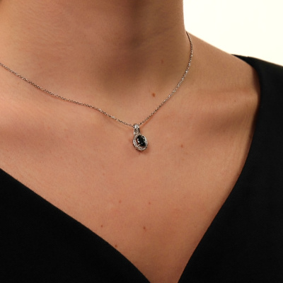 Подвеска с 26 бриллиантами природными, 0.07 карат, огранка круг 17 граней, цвет 2, чистота 2, тип огранки Б; 1 сапфиром природным, 1.06 карат, цвет 2, чистота 2, тип огранки Б; Белое золото 585 пробы.