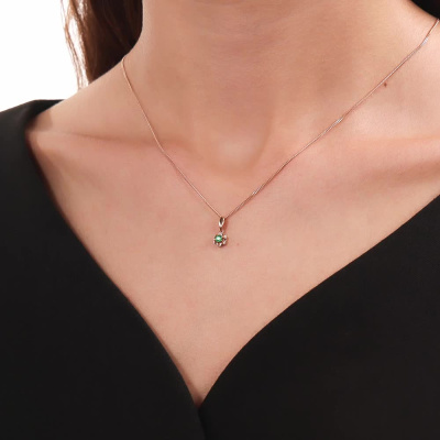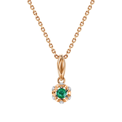 Подвеска с 6 бриллиантами природными, 0.01 карат, огранка круг 17 граней, цвет 2, чистота 2, тип огранки Б; 1 изумрудом природным, 0.06 карат, цвет 3, чистота 3, тип огранки В; Розовое золото 585 пробы.