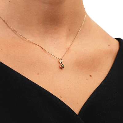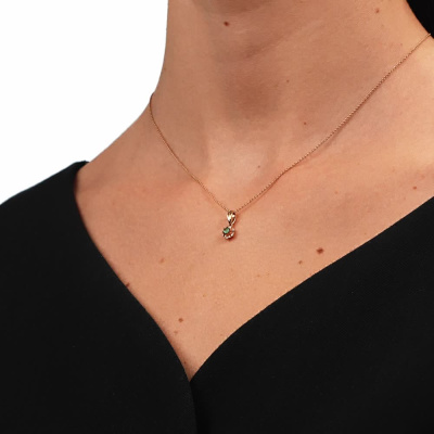 Подвеска с 6 бриллиантами природными, 0.01 карат, огранка круг 17 граней, цвет 2, чистота 2, тип огранки А; 1 изумрудом природным, 0.06 карат, цвет 3, чистота 3, тип огранки В; Розовое золото 585 пробы.