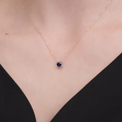 Подвеска с 14 бриллиантами природными, 0.04 карат, огранка круг 17 граней, цвет 2, чистота 2, тип огранки Б; 1 сапфиром синтетическим, 0.6 карат; Розовое золото 585 пробы.