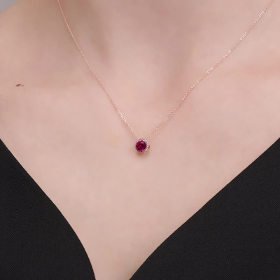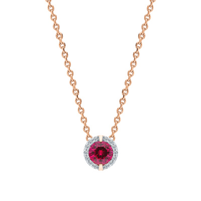 Подвеска с 14 бриллиантами природными, 0.05 карат, огранка круг 17 граней, цвет 2, чистота 2, тип огранки А; 1 рубином синтетическим, 0.6 карат; Розовое золото 585 пробы.