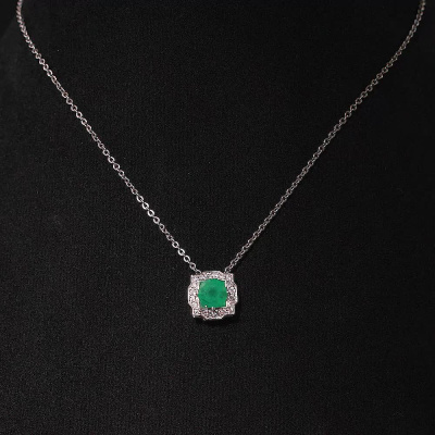 Подвеска с 8 бриллиантами природными, 0.07 карат, огранка круг 57 граней, цвет 3, чистота 6, тип огранки А; 12 бриллиантами природными, 0.08 карат, огранка круг 57 граней, цвет 3, чистота 6, тип огранки А; 1 изумрудом природным, 0.71 карат, цвет 3, чистота 3, тип огранки В; Белое золото 585 пробы.