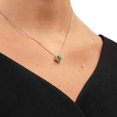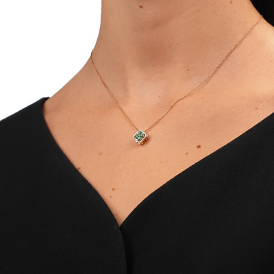 Подвеска с 24 бриллиантами природными, 0.06 карат, огранка круг 17 граней, цвет 2, чистота 2, тип огранки А; 4 изумрудами природными, 0.29 карат, цвет 3, чистота 3, тип огранки В; Розовое золото 585 пробы.