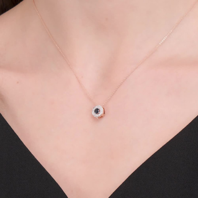Подвеска с 15 бриллиантами природными, 0.04 карат, огранка круг 17 граней, цвет 2, чистота 2, тип огранки А; 1 сапфиром природным, 0.2 карат, цвет 2, чистота 2, тип огранки В; Розовое золото 585 пробы.