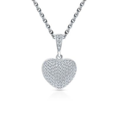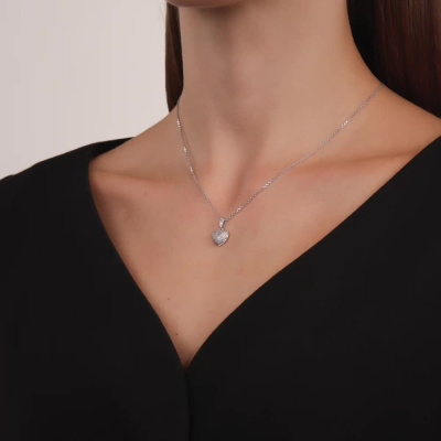 Подвеска с 1 бриллиантом природным, 0.007 карат, огранка круг 57 граней, цвет 3, чистота 6, тип огранки А; 2 бриллиантами природными, 0.009 карат, огранка круг 17 граней, цвет 2, чистота 2, тип огранки А; 115 бриллиантами природными, 0.24 карат, огранка круг 17 граней, цвет 2, чистота 2, тип огранки А; Белое золото 585 пробы.