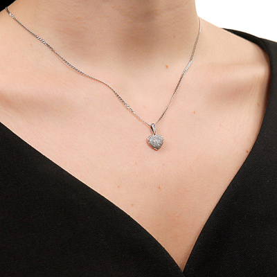 Подвеска с 1 бриллиантом природным, 0.007 карат, огранка круг 57 граней, цвет 3, чистота 6, тип огранки А; 2 бриллиантами природными, 0.008 карат, огранка круг 17 граней, цвет 2, чистота 2, тип огранки А; 115 бриллиантами природными, 0.24 карат, огранка круг 17 граней, цвет 2, чистота 2, тип огранки А; Белое золото 585 пробы.