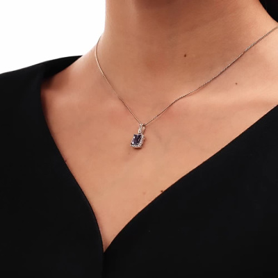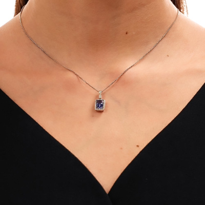Подвеска с 2 бриллиантами природными, 0.02 карат, огранка круг 57 граней, цвет 4, чистота 6, тип огранки А; 20 бриллиантами природными, 0.15 карат, огранка круг 57 граней, цвет 4, чистота 6, тип огранки А; 7 бриллиантами природными, 0.02 карат, огранка круг 57 граней, цвет 4, чистота 6, тип огранки А; 1 танзанитом природным, 1.14 карат; Белое золото 585 пробы.