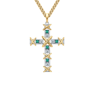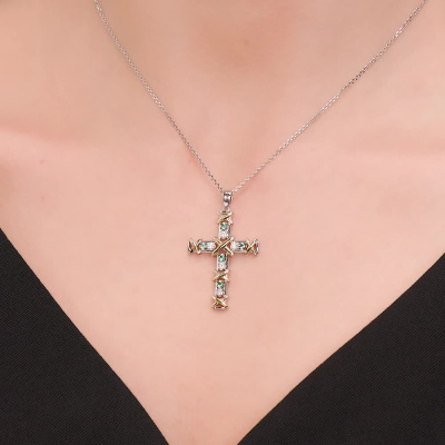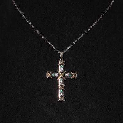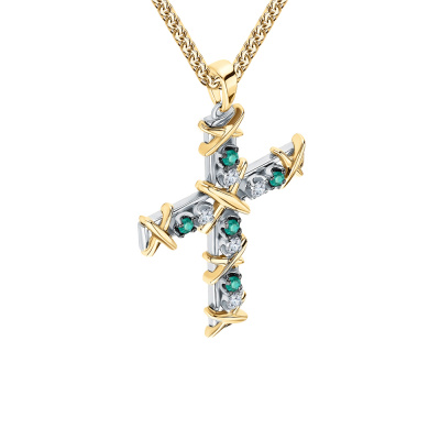Подвеска с 5 бриллиантами природными, 0.14 карат, огранка круг 57 граней, цвет 3, чистота 6, тип огранки А; 5 изумрудами природными, 0.14 карат, цвет 3, чистота 3, тип огранки В; Желтое и белое золото 585 пробы.